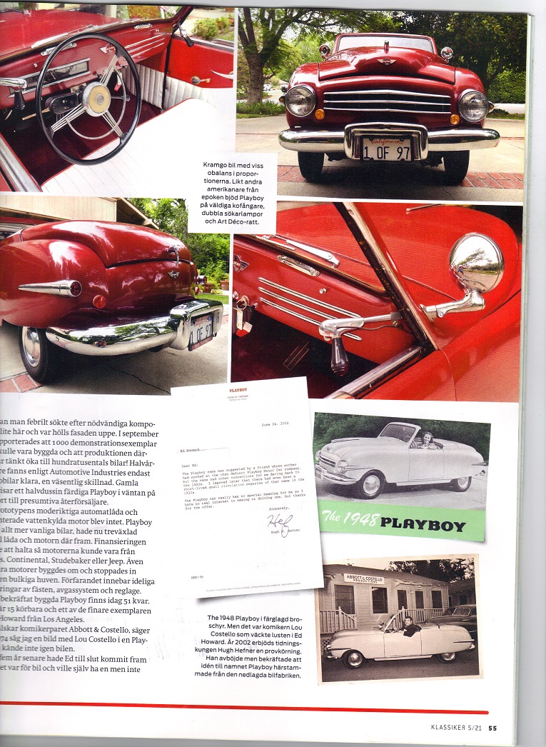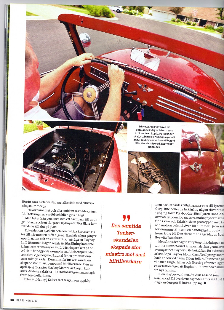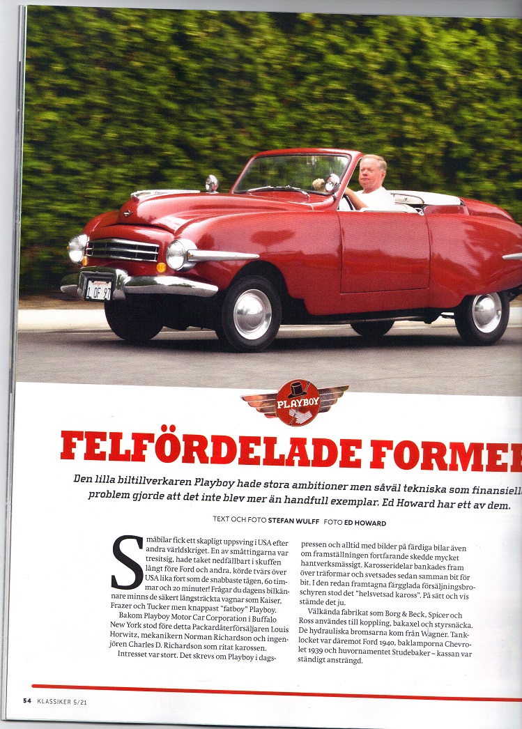 July 7, 2021 - If you are able to obtain a copy of the May/June 2021 issue of Swedish classic car magazine "KLASSIKER" then check out page 54 for a nice article on the Playboy car featuring Car #34, owned by the Webmaster of this site! Here are a couple of sample photos from that magazine's cover and the article. Of course, the artcile is all written in Swedish! Enjoy!