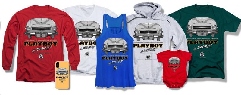 March 19, 2019 - Fans of America's pioneer retractable hardtop convertible can now showcase their favorite car! Manufactured in one of Pixel’s 14 global production facilities, these stylish shirts feature the iconic Playboy grille and front fenders as illustrated by author/illustrator Robert D. (Bob) Cunningham. The artwork is further enhanced with the corporate logo and advertising slogan used in vintage Playboy advertising. Choose from t-shirts, tank tops, hoodies and baby onesies in a wide variety of sizes and colors. There’s even a smart phone case!