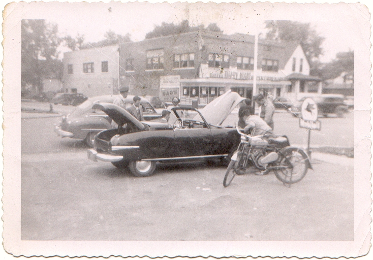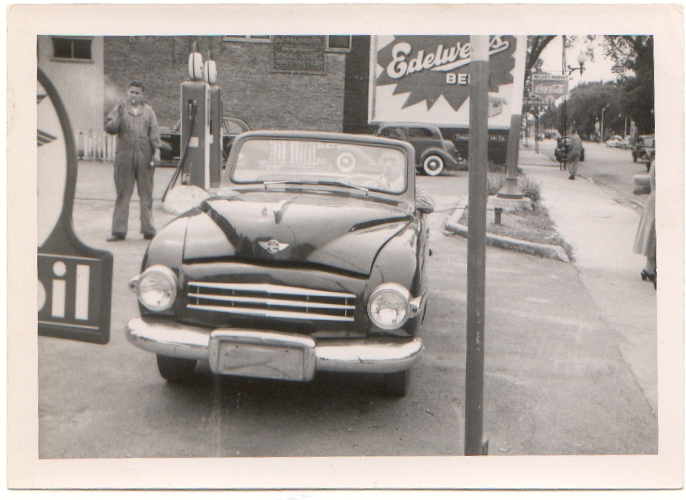 We have received these three wonderful historical photos shown below from the private library of a website viewer now living in Arkansas whose father had invested money to be a prospective Playboy car dealer in Illinois back in 1948. His father was allowed to borrow a Playboy car for two weeks in order to show prospective buyers what they would get by purchasing a Playboy car. Our website viewer is pictured in coveralls in the first photo and his father is pictured driving a car in the second photo outside their shop in Illinois.